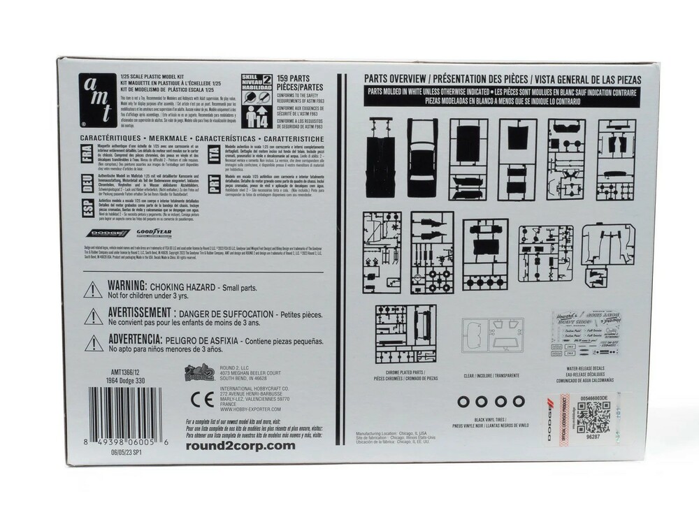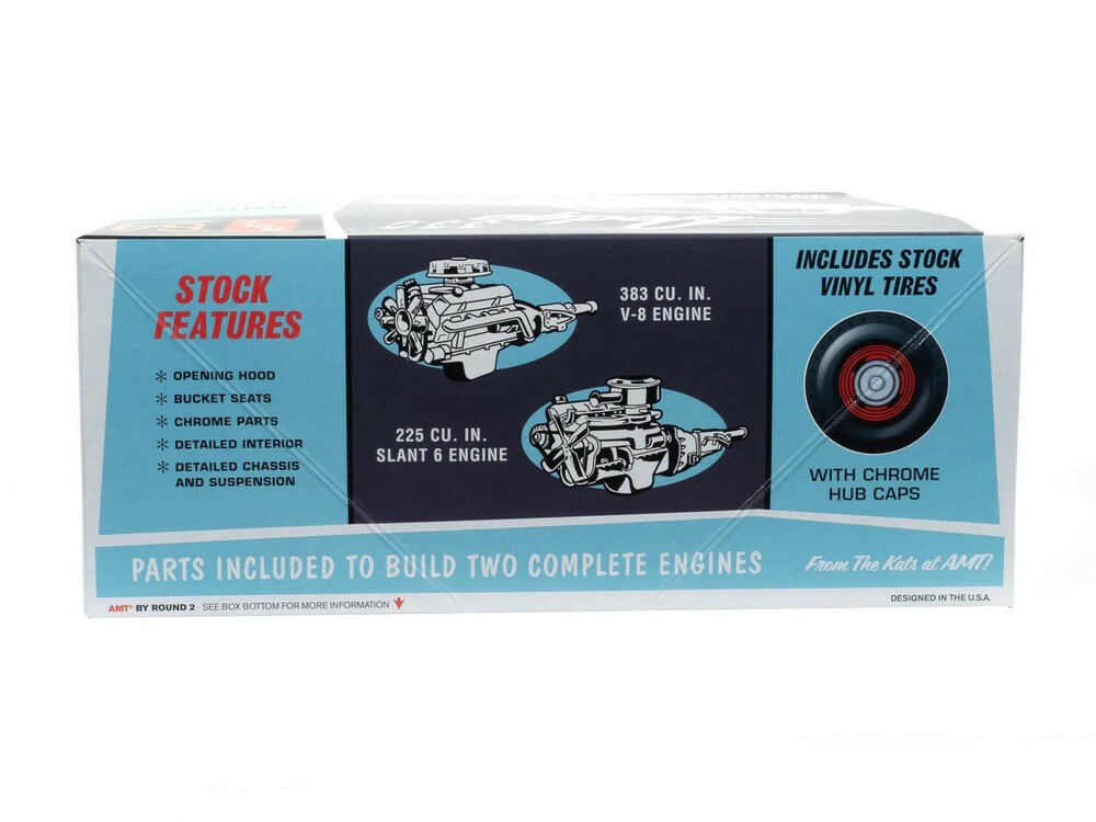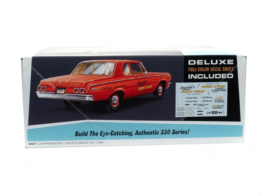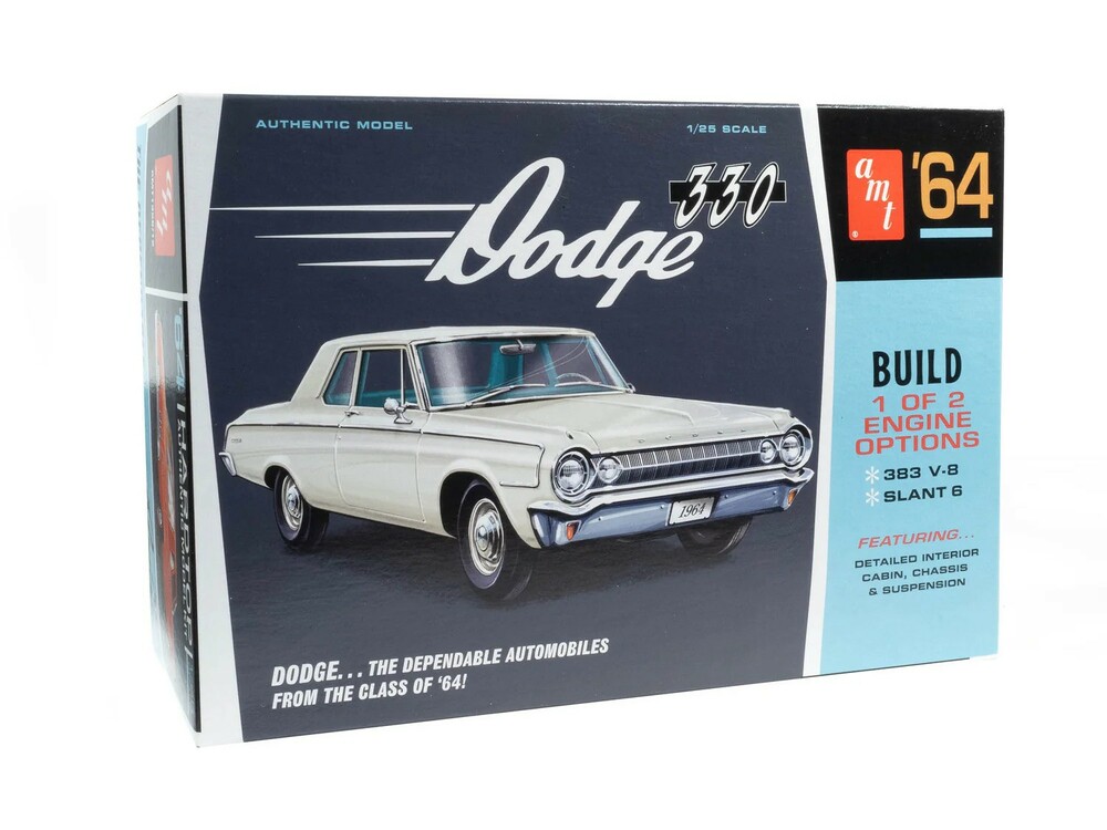 Authentic details: The 1964 Dodge 330 kit includes parts to build two complete engine options: a 383 V-8 and Slant 6 engine, chrome hub caps, opening hood, detailed interior cabin, chassis, and suspension, colorful water-slide decals and more—all wrapped up in eye-popping, vintage-style packaging!