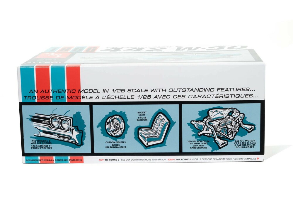 This authentic model has some outstanding features including a 360 HP, 400 cu. in. V8 with three 2-barrel carburetors, a W30 air intake, 442 emblems, bucket seats, custom wheels, and BONUS pad-printed red line tires. The kit also includes an all-new water slide decal sheet and is all wrapped up in AMT’s vintage-style packaging.