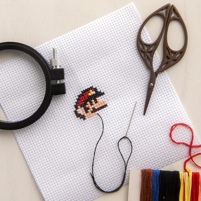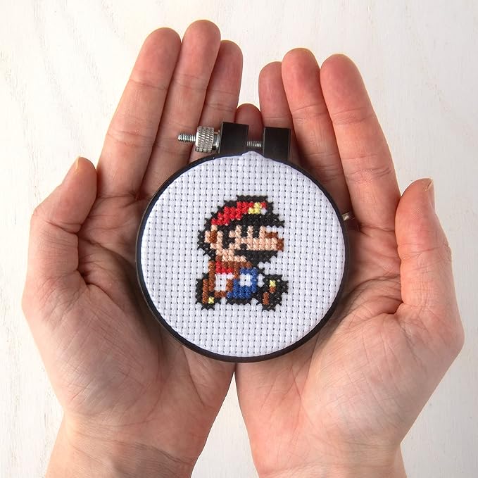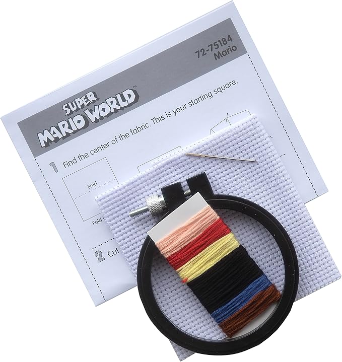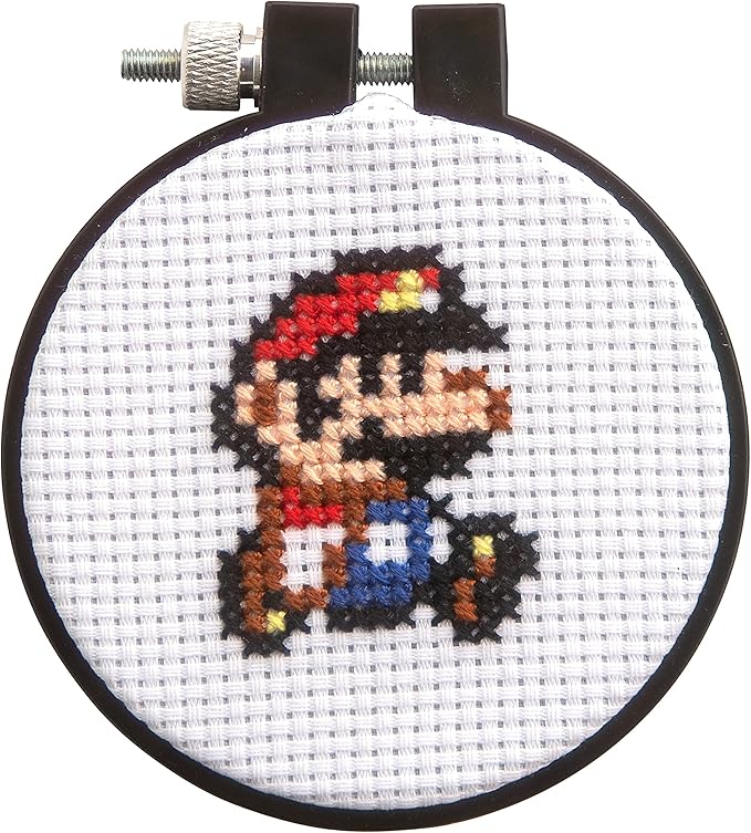 Here's a new and unopened complete COUNTED crosstitch kit for beginners entitled "Mario." The design features Super Mario on a mission to find the princess and defeat Browser! The enclosed matching black stitching hoop doubles as a frame for displaying your completed project. This 'Learn a Craft' kit is ideal for beginners, kids, or anyone who wants to work on a simple and fast project! Perfect for fans of Super Mario Bros and to display in any child's bedroom or in a game room!