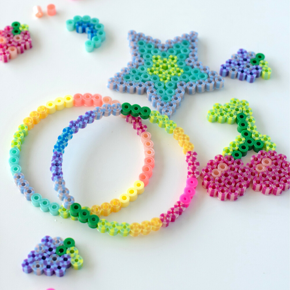 14 projects, for ages 6 and up. The Perler Stripes 'n Jewelry fuse bead kit includes 2000 beads, Snap-ins, Motionators and Mini-Motionator tool, 3 pegboards—small circle, flower, and 5-point star—plus break-away silicone jewelry—2 necklaces plus a bracelet and a ring—and lacing, ironing paper, pattern sheet with easy instructions. Bead colors include pink, pastel yellow, dark green, pearl light blue, pearl light pink, pearl coral, grape stripe, royal blue pearl stripe, prickly pear pearl stripe, gold pearl stripe, raspberry pearl stripe, and periwinkle blue/pearl light pink stripe.