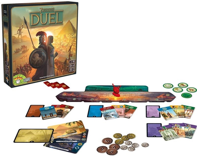 In 7 Wonders Duel, each player is leading a civilization and will, over the course of 3 ages, construct Buildings and Wonders. Each card represents a Building which helps the player to strengthen their army, make scientific discoveries or develop their city. 7 Wonders Duel is specially made for 2 players with an ongoing tension between the two for a heated battle to achieve victory.