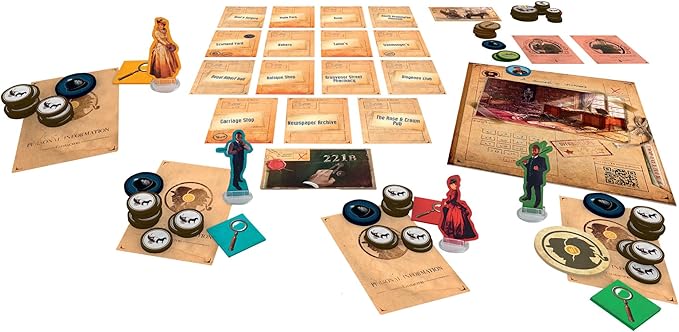 Race to find the truth in the mysterious world of Watson & Holmes, a game of deduction and intrigue for two to seven players. Each aspiring detective will work alongside Sherlock Holmes in order to solve a series of mysterious cases. By visiting locations, speaking with witnesses, and deciphering clues, you will come to your own conclusions about the investigation, independent of your fellow detectives. Once you believe you have all the facts, you must present your findings to the brilliant Holmes and the good Dr. Watson. Answering every question correctly will lead you to victory, though one misstep and you will be forced to retire from the case, leaving the remaining investigators to accurately interpret the clues before it's too late.