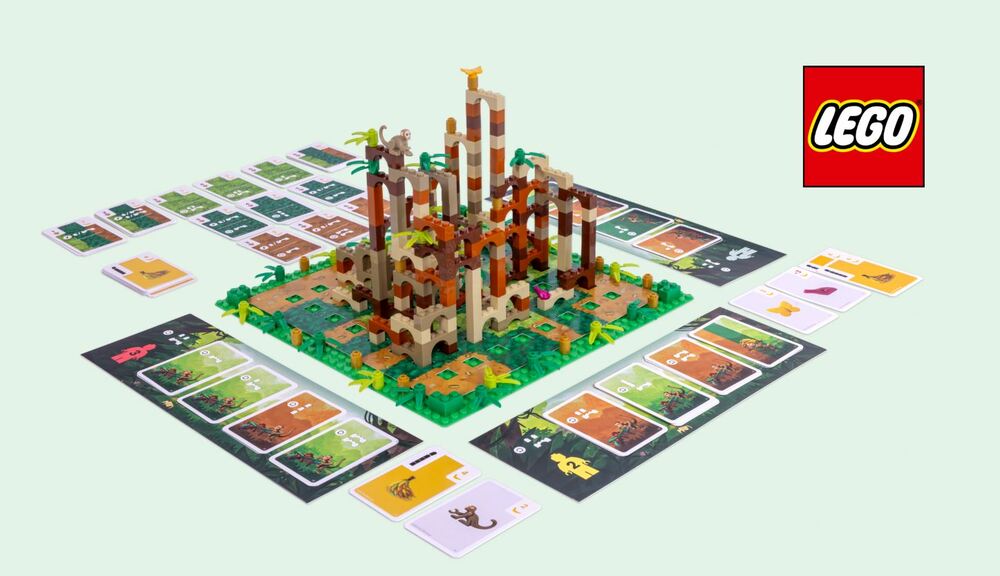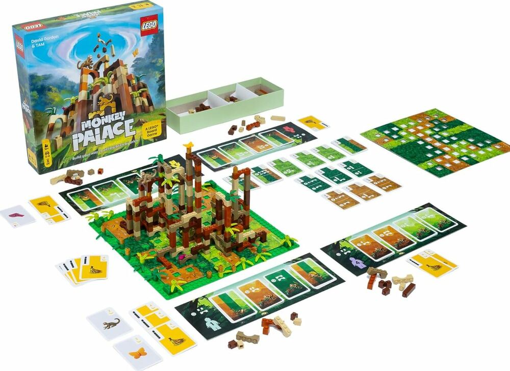 - 1 LEGO® plate 32×32, 231 LEGO® bricks, 67 Monkey Cards, 14 Bonus Cards, 3 Trophy Cards, 4 Player Boards, 2 Ground Maps with maps on both sides, 1 Brick Tray, 1 Rule Book.