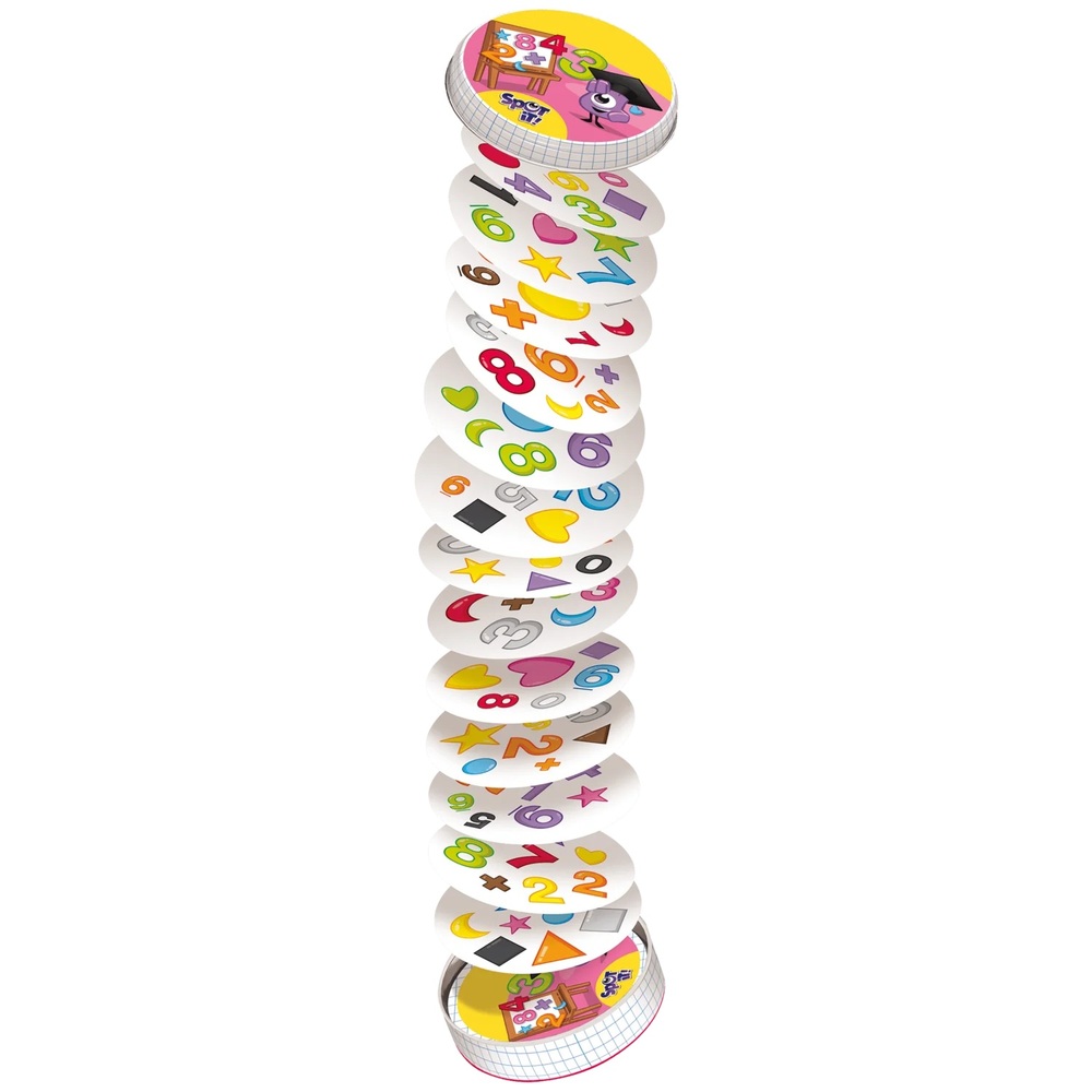 Now your littlest ones can play the wildly popular Spot It game! In addition to having fun, children learn their numbers 1-9 and basic geometry shapes like triangles and circles. Color is also reinforced as players search for their matches, as all matches need to be the same color. Game play is quick, around ten minutes and the included instructions offer 5 ways to play with different challenge levels. The rule booklet includes advanced play tips for little learners ready to explore simple arithmetic and the properties of shapes.