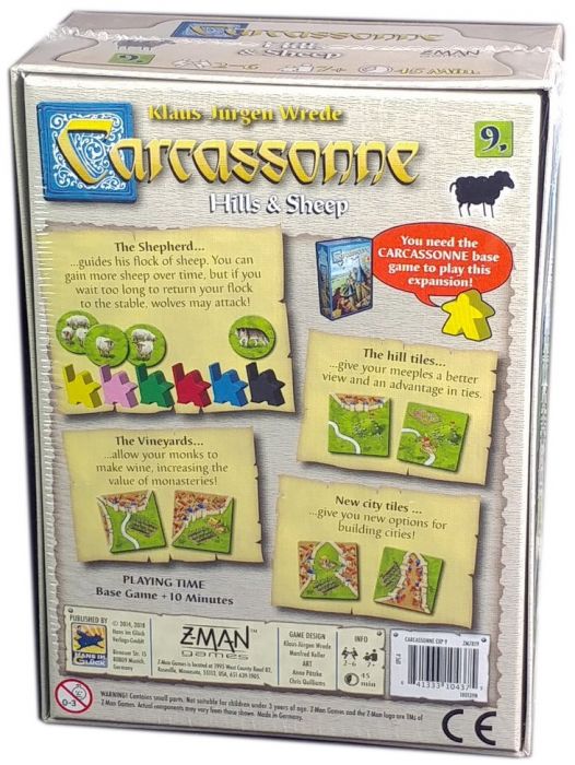Grow your flock, gain the high ground with hills, and cultivate a profitable vineyard in the ninth expansion for Carcassonne.