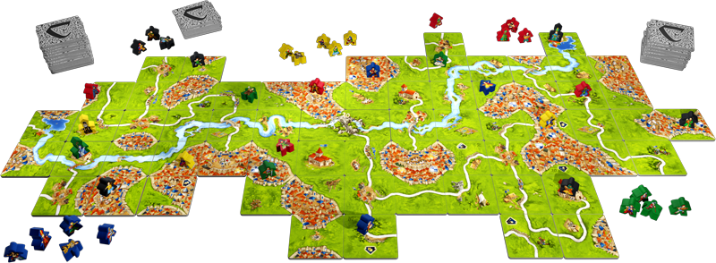 Carcassonne is a tile-placement game in which the players draw and place a tile with a piece of southern French landscape on it. The tile might feature a city, a road, a cloister, grassland or some combination thereof, and it must be placed adjacent to tiles that have already been played, in such a way that cities are connected to cities, roads to roads, etcetera. Having placed a tile, the player can then decide to place one of their meeples on one of the areas on it: on the city as a knight, on the road as a robber, on a cloister as a monk, or on the grass as a farmer. When that area is complete, that meeple scores points for its owner.