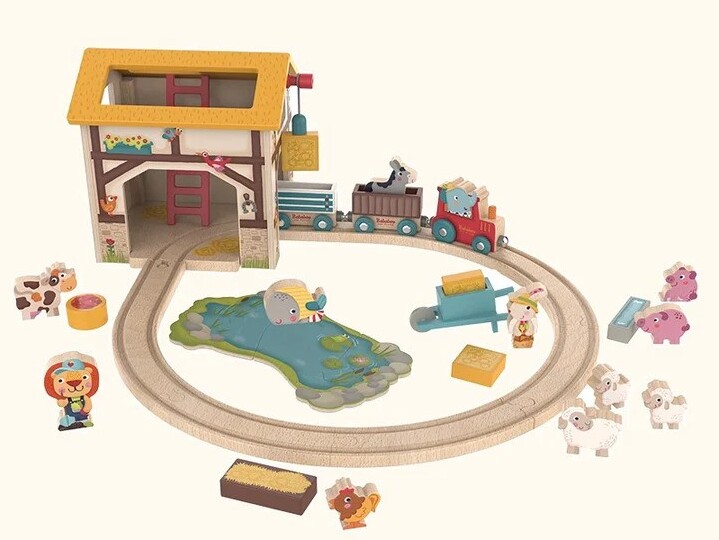 Bababoo and his friends enjoy spending time in their wooden farm with wooden train tracks set!