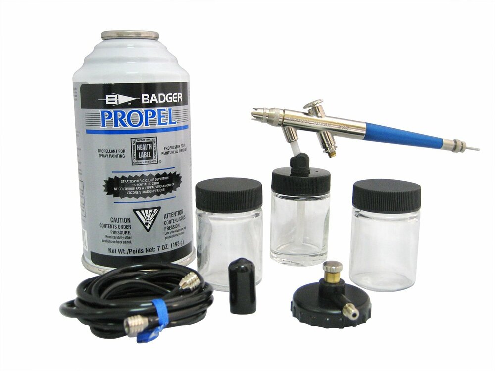 The Model 200-3 Badger's 200NH single action, internal mix, siphon feed airbrush offers the ease of single action operation while providing the fine spray pattern of internal mix paint atomization for professional results Depressing the trigger releases a pre-set amount of color which can be regulated by turning a needle adjustment screw at the back of the airbrush handle. Once the desired paint flow is set the air brush will maintain the preset spray pattern until the user chooses to change it. Sprays 1/32-inch (0.8 millimeter) to a 2-1/2-inch (63 millimeter) pattern. Simplicity of use makes this the top choice for the advanced model painter or decorative stenciler It is also an excellent airbrush for painting posters, auto detailing and ceramics. The Model 200NH will spray inks, dyes, watercolors, gouaches, properly reduced acrylics, fabric paints, modeling paints, automotive lacquers and enamels, most ceramic stains and glazes, Air-Tex, SpectraTex, Air-Opaque and MODELflex airbrush colors. The Model 200-3 Set contains 200NH airbrush with general purpose needle/nozzle and attachable jar, protective cap, vinyl air hose, Propel regulator, Propel can, additional jar with cover, head wrench and instruction manual Proudly made in the USA; Easy maintenance and cleaning, Self-lubricating PTFE needle bearing enables continuous proper paint flow and prevents needle wear.