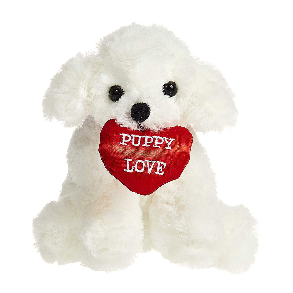 Pup E. Love is an adorable little plush puppy holding a Valentine heart that reads 'Puppy Love'.