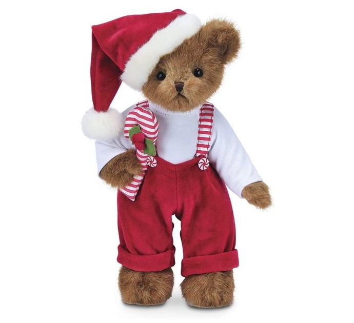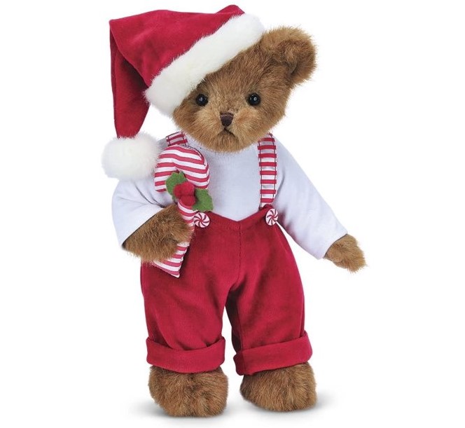 This adorable Christopher Cane Christmas Teddy bear has the design of a classic bear, with the softness of modern plush. Christopher is dressed in red pants with adorable candy-striped suspenders, a Santa hat and a candy cane. This Christmas bear is the perfect size for cuddling and is sure to become a treasured companion. Hand crafted using the most luxuriously soft plush, this bean bag weighted, posable bear is perfect for everyone from the collector to a special child in your life.