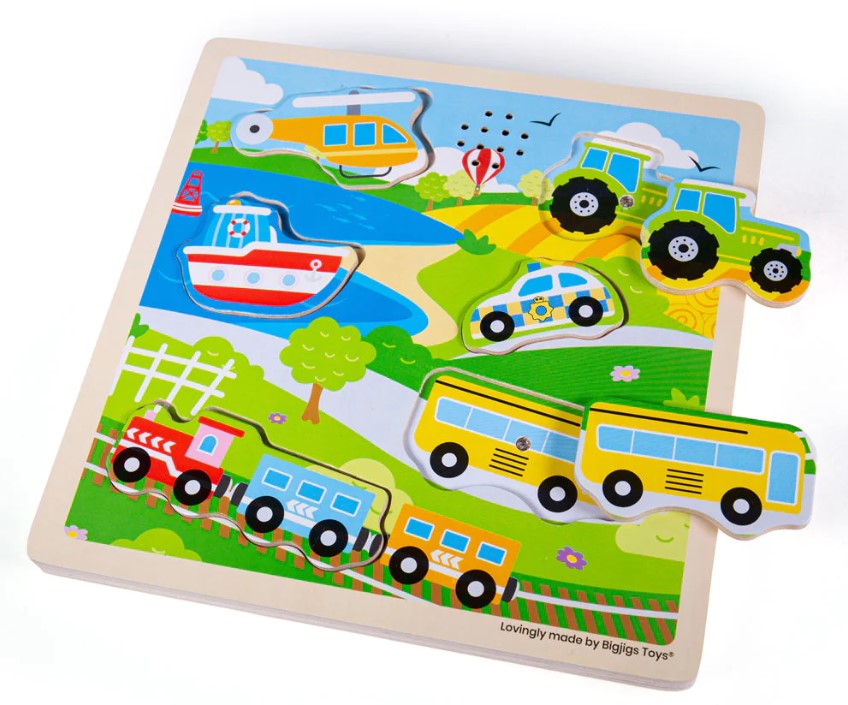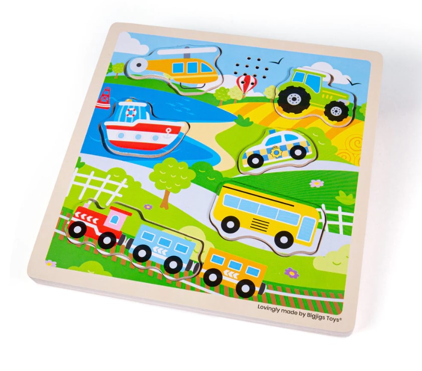 Sound puzzles are a fun way for children to learn about the different noises vehicles make for the tractor, helicopter, train, boat, police car and bus. This vibrant wooden puzzle is perfectly sized for little hands to grasp, examine and place and build their transport knowledge.