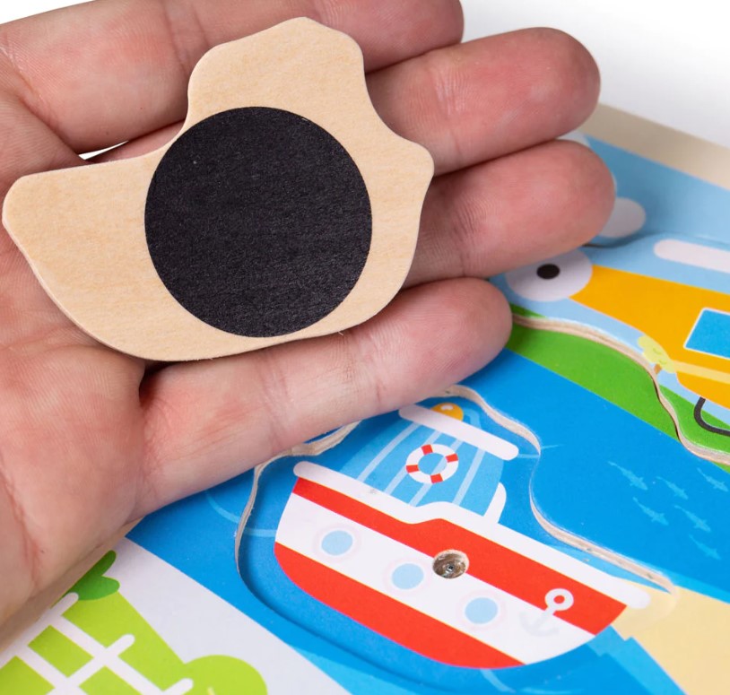 Beep beep, honk honk! The Transport Sound Puzzle requires little fingers to place the vehicle puzzle pieces into the correct slots. When the correct piece is laid down, the jigsaw puzzle makes a transport sound.