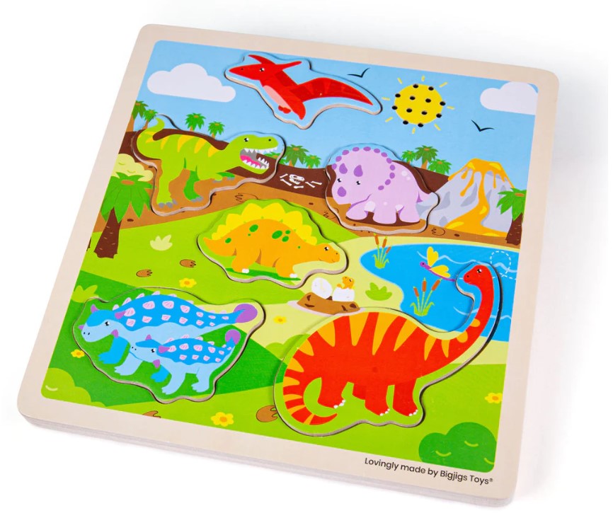 - -Dinosaur sound puzzle makes noise when correct piece is laid down
