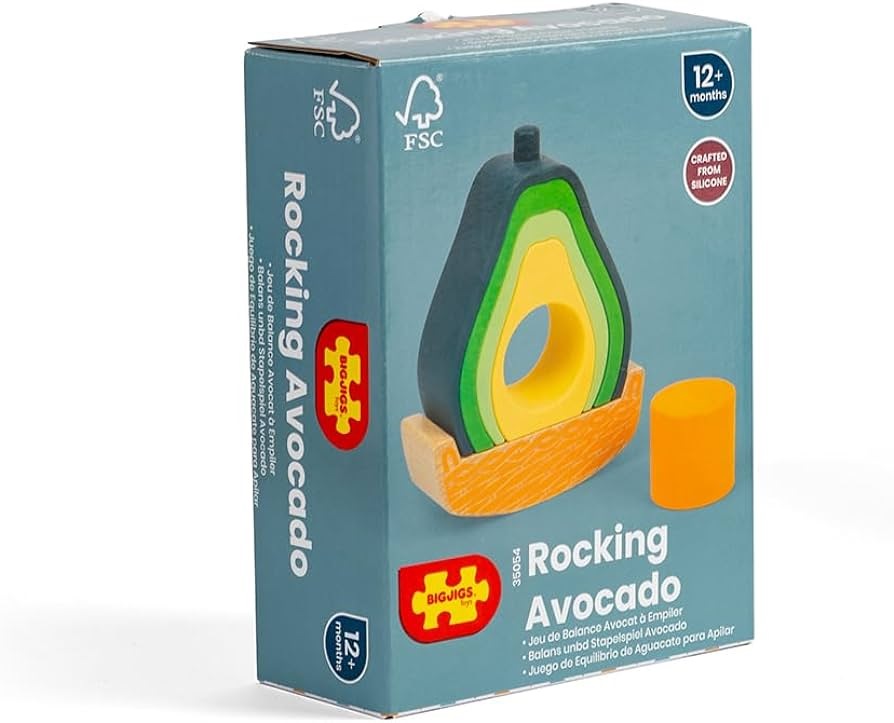Avo-go at slotting and stacking this quirky avocado toy! Our Silicone Rocking Avocado is a clever little fruit, with lots of activities in one. Little munchkins can stack it into creative shapes, nest the pieces back together and make it sway in its wooden rocking base.