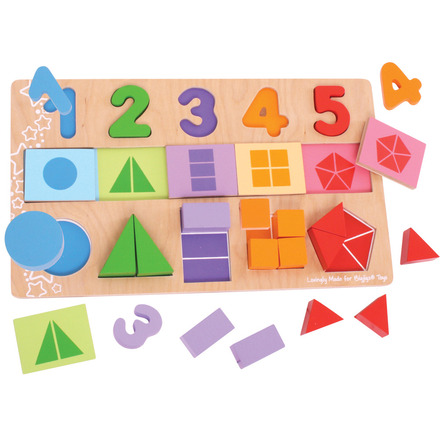 My First Fractions Puzzle is perfect for introducing basic numeracy and fractions to your little one through play. This puzzle introduces counting and the concept of fractions using brightly colored wooden puzzle pieces that include numbers and shapes. Match the colored shapes to the numbers and colors on the base board and count out how many pieces make a whole as you work out how the pieces fit together.