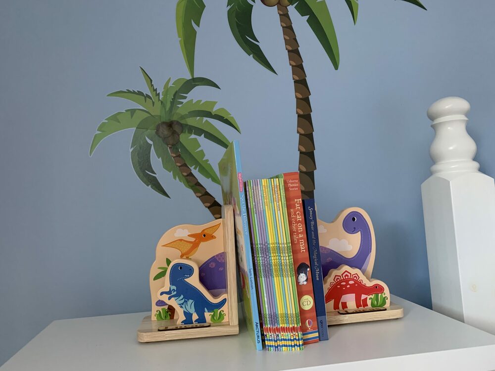These wooden dinosaur bookends are a contemporary and colourful dinosaur theme features on the bookends of different dinosaurs a Pterodactly, T-Rex and Diplodocus across the two bookends. coloured. They are a perfect room accessory to store favourite bedtime stories. As these bookends are contemporary and attractive this may encourage your little one to select their favourite book.