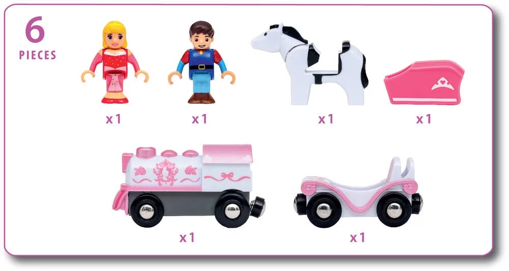 - 1x Sleeping Beauty battery train, 1x Sleeping Beauty wagon, 1x Princess Aurora character, 1x Prince Phillip character, 1x Samson the horse, 1x horse blanket