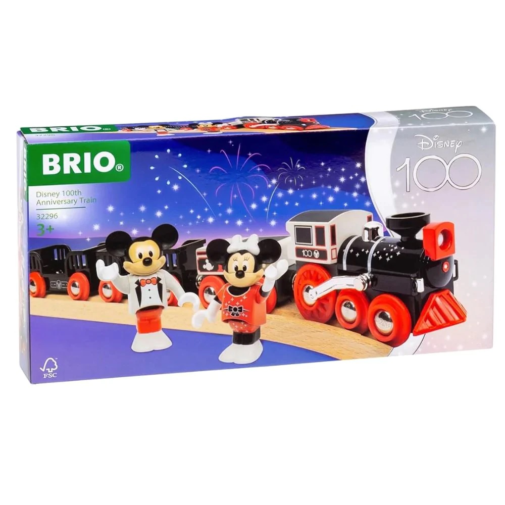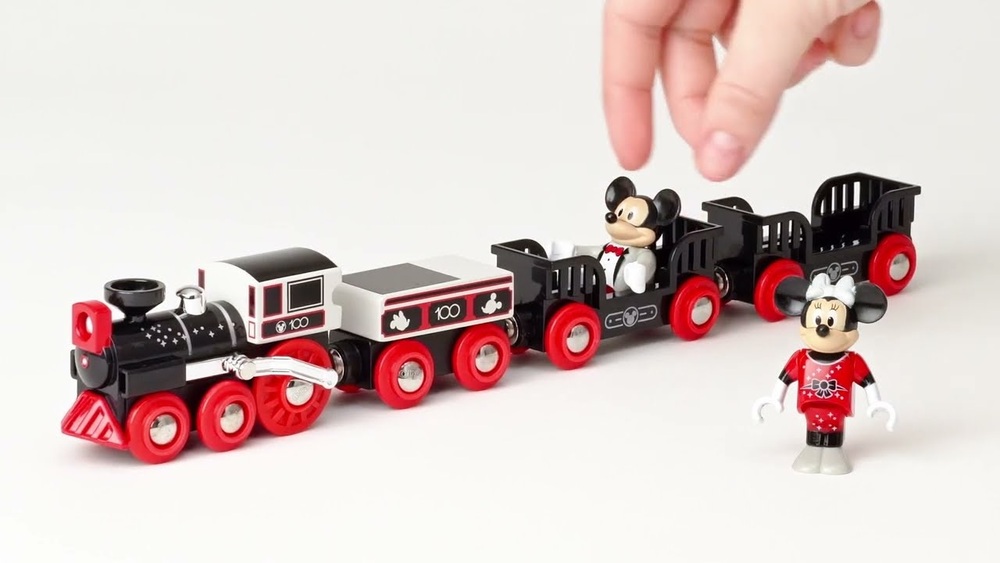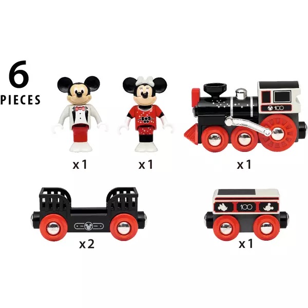Nice BRIO train in black with red and silver details. Two wagons with room for passengers and a little trailer are included. Also included is a Mickey Mouse and Minnie Mouse figure in fine clothes. The train carriages are decorated with "100" and Mickey and Minnie faces.