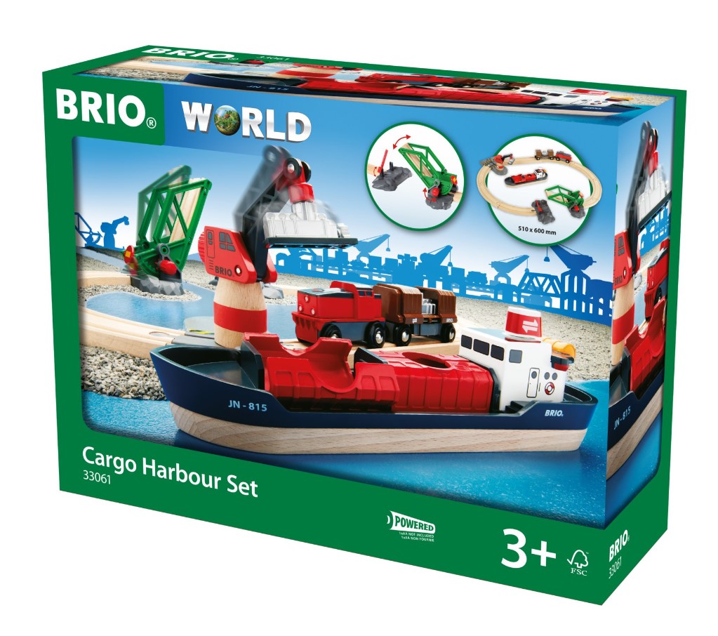 The container ship sails across the water and arrives in the harbour with cargo. The battery operated train is waiting to get loaded with help from the multi-function crane. Slide open the boxcar doors and hide the cargo inside for safe delivery. As the ship leaves the harbor, do not forget to open up the bridge to allow it to pass by the tracks. Ages 3+