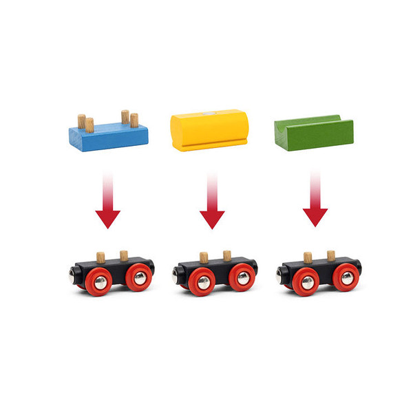 Celebrate classic railway play with the 36036 65th Anniversary Train Set. This all wooden train set takes inspiration from our iconic BRIO railway products first launched in 1958. The 32 piece set is made from FSC-certified European beech wood and includes a classic BRIO train with 3 wooden wagons in bright colours, bridge, switching tracks and wooden trees for scenic decoration.
