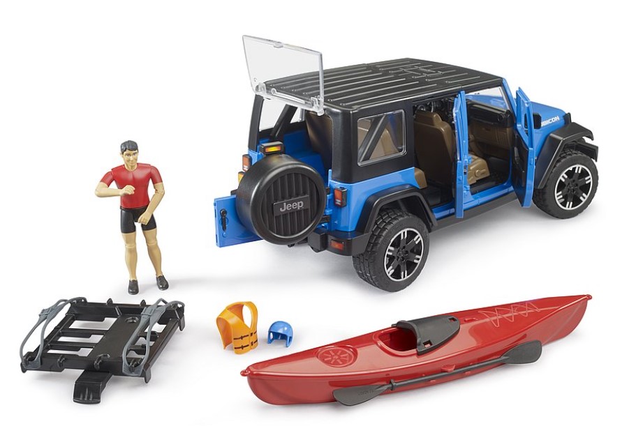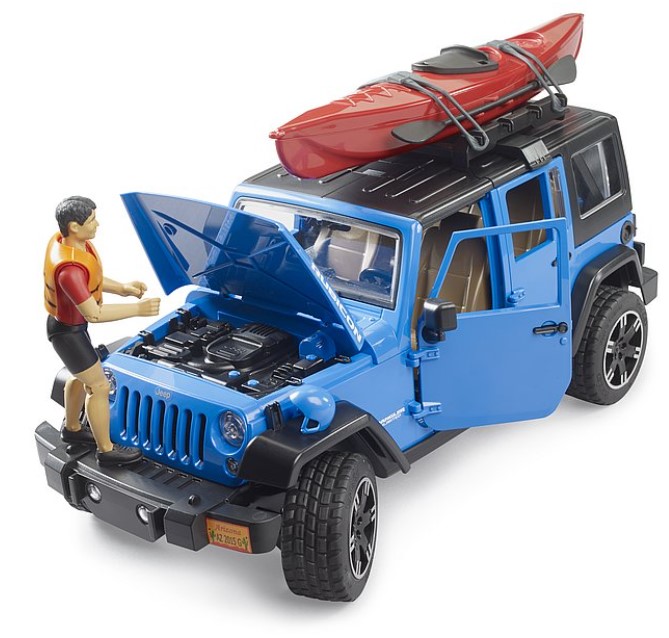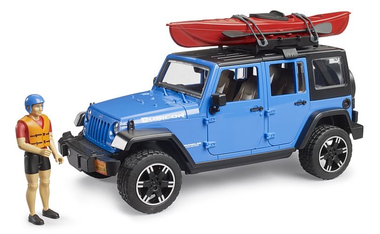 Reach the most beautiful water sports areas in the brilliant off-road Jeep Wrangler Rubicon Unlimited. In addition to the two-part, detachable segment roof, the bonnet, rear door and all four side doors open. It goes without saying that the vehicle provides enough space on the inside for four BRUDER bworld figures. Alternatively, the rear seat can be removed to create space for accessories compatible with BRUDER standard connectors in the loading area. The additional drag link is intended to facilitate steering through the roof hatch and if it is not required, it can be stored in the vehicle underbody. The axles feature typical off-road vehicle suspension and tread tyres with chrome wheels in appealing SUV design. The kayak is transported on the supplied roof rack.
