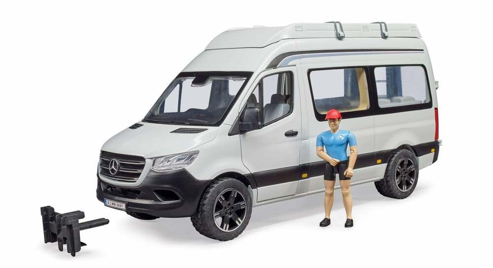 Camping is absolutely on trend. Mobile home registrations across Europe reached new heights in 2018 and 2019. This exciting leisure theme can now be experienced by young campers at BRUDER. The new MB Sprinter is also extremely successful as a base model for camper vans. The BRUDER version of the new MB Sprinter camper has an impressive level of detail and versatility. The driver's cab door and rear doors open. Here, the supplied bworld figure has access to the integrated double bed and large storage compartment. A particular highlight is the newly developed sliding door on the co-driver's side, which provides access to the kitchen unit. The camper van has an extendable awning for sunny days, as well as stylish camping furniture and tableware.
