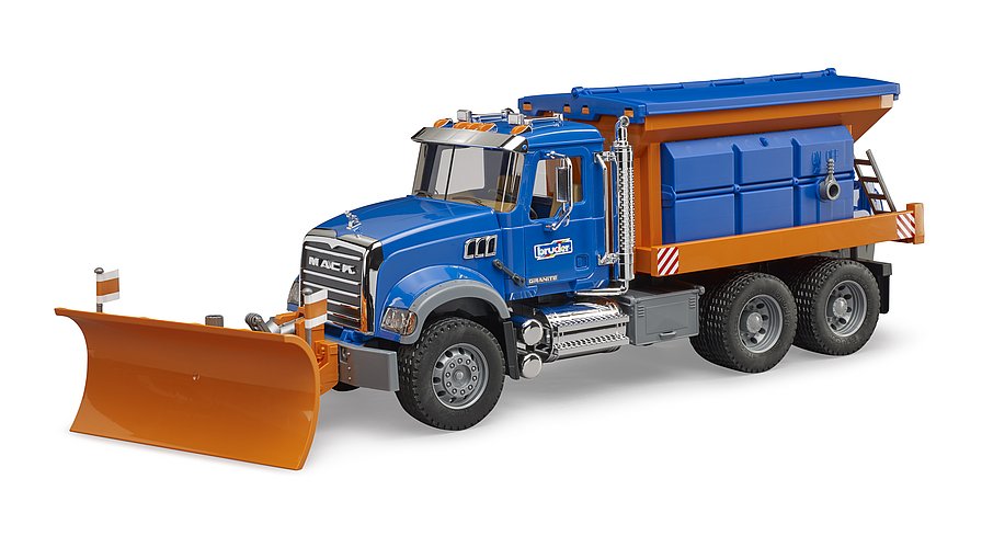 "... heavy snowfall down to low lying areas ...", as soon as the motorists' information delivers this message the road clearance vehicles are out on the road, working round the clock. Known for its realistic vehicles that are suitable for all weathers, BRUDER has developed an impressive winter service vehicle based on a Granite truck, which matches the original in every detail. The wide, height adjustable and, of course, also detachable snow plough pushes even the thickest piles of snow aside, ensuring a passable track. The extremely realistic gritter spreads sand or other gritting products onto the road to ensure non-skid driving.