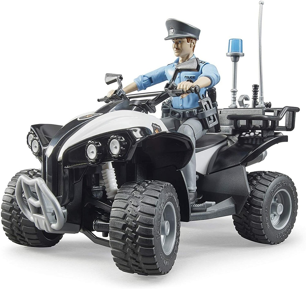 Just like in normal life, an increasing amount of traffic with BRUDER vehicles means traffic violations are on the rise. For this reason, bworld now also features a police force to enforce law and order. A quad bike unites the compact dimensions of a motorbike and the flexibility of a cross country vehicle. Consequently, it is hardly surprising that the police is increasingly using quad bikes. The BRUDER quad bike convinces with a very modern police design to leave an impression during day-to-day activities as well as on challenging cross country terrain during a pursuit. The suspension on both axles and the steered front axle make the quad bike very agile and enable precise manoeuvrability even in the toughest terrain. The quad bike is ideally suitable as a day-to-day emergency services vehicle with its removable luggage rack, drawbar coupling and brackets for tools. The lifelike vehicle replica in connection with the bworld police officer lend the set a very realistic appearance. A fixed handle on the handlebars and a seat adapted to a sporty rider position mean the rider never loses control, even when racing over rough terrain. The bworld police officer is fully equipped to reinforce the authority. The waist belt features important tools for day-to-day police work, such as flashlight, walkie talkie, and baton.