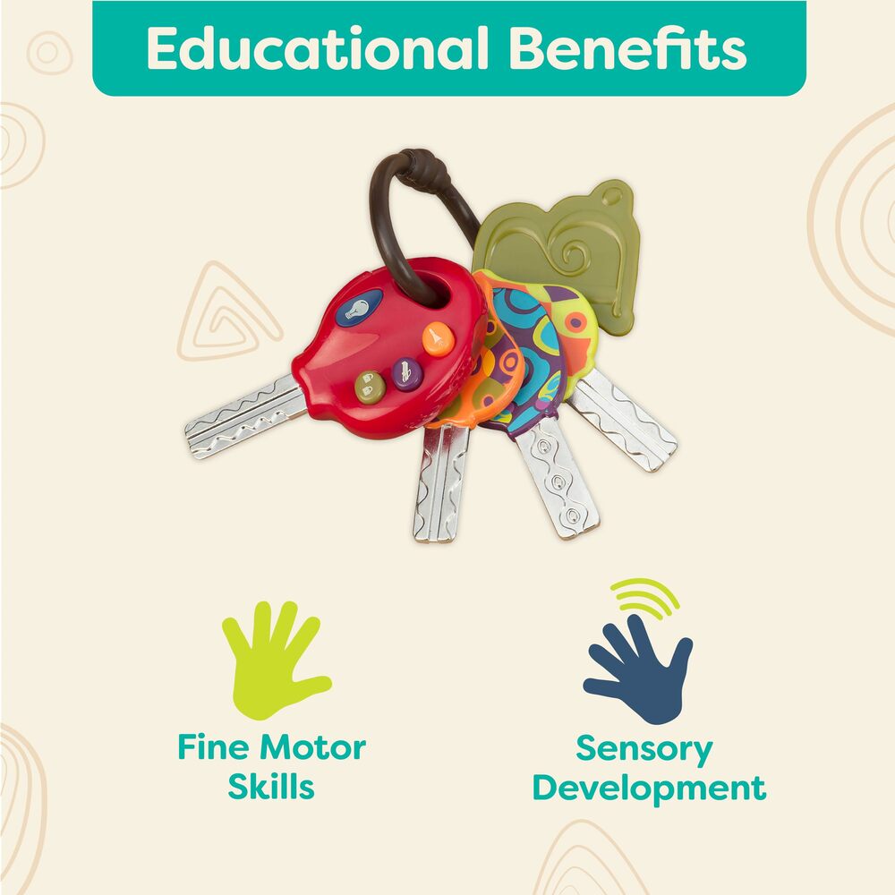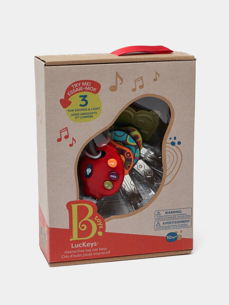 Go anywhere, anytime in your make-believe car with LucKeys! This multicoloured key ring includes 4 textured keys and a driver’s key that features a push-button flashlight and exciting sounds such as a horn and a car ignition! (But don’t sweat the sound – this baby toy is easy on grown-up ears).