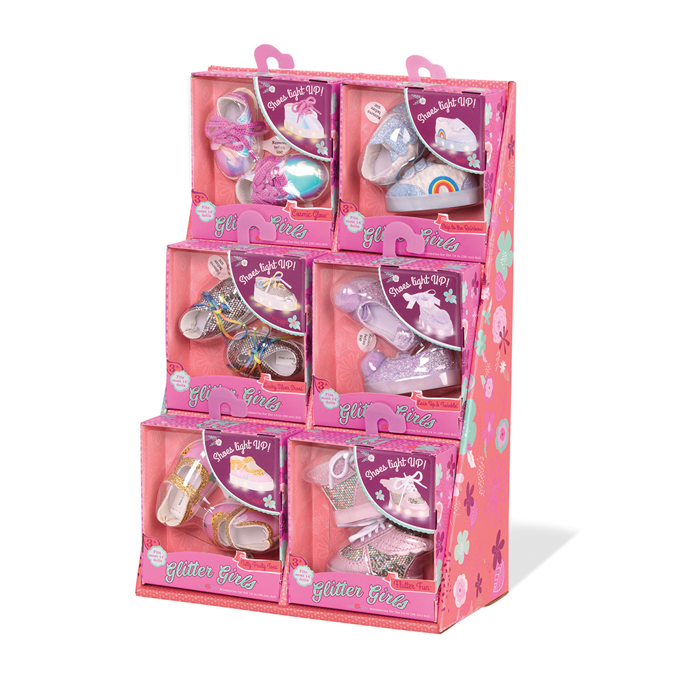 Glitter Girls pay close attention to what's trendy and they know how to pick the best outfit for any occasion. This fashion light-up shoe set comes with pieces that are easily matched with other outfits in the Glitter Girls collection, and are compatible with most 14" dolls. Your doll will never have a problem finding something to wear! Each Sold Separately.