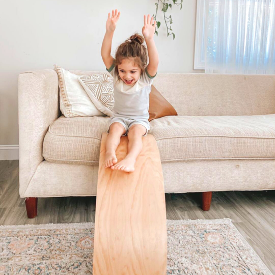 The Bunny Hopkins™ Honey Maple Wobble Board has a warm honey hued wood stain which makes the wood grain nicely visible while being a natural birch wood finish. A really nice vibrant addition to your kids play area!