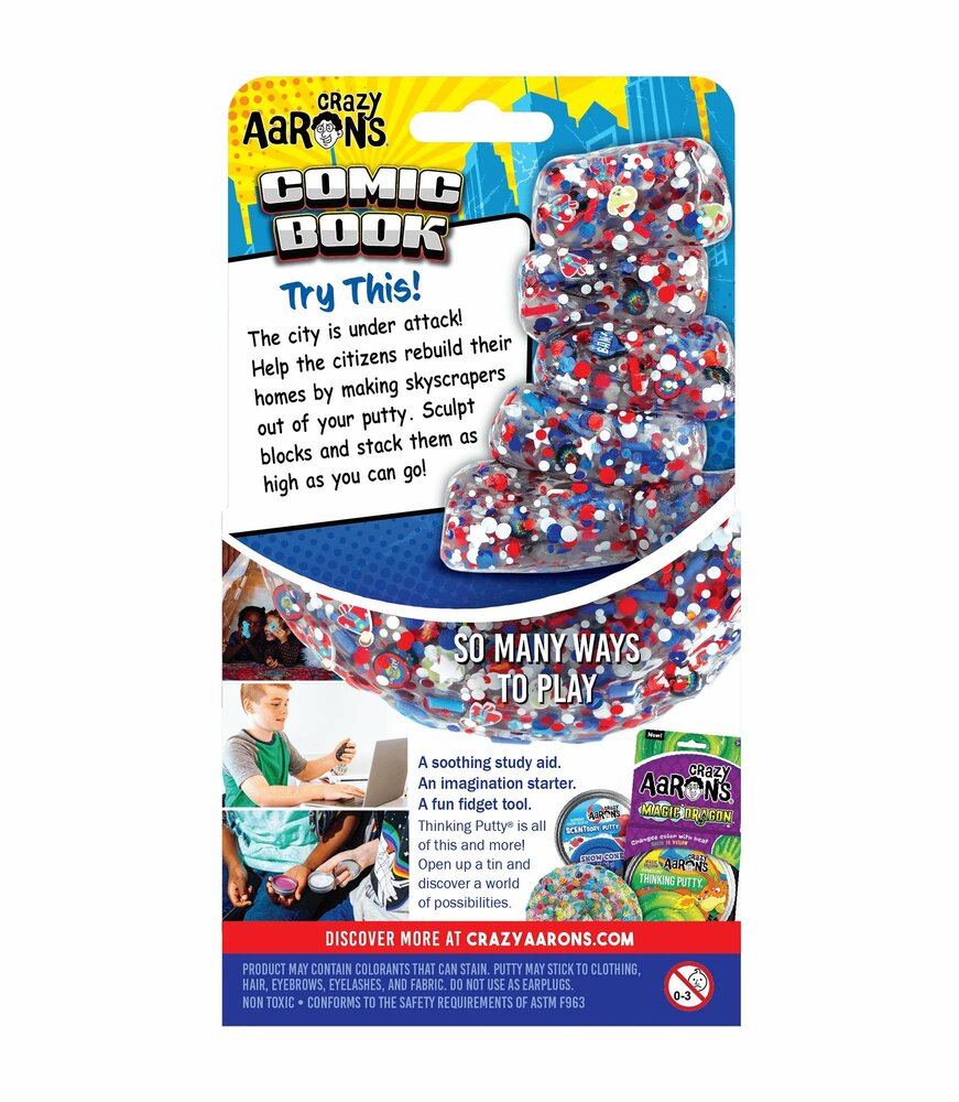 Comic Book Thinking Putty features beautiful colors that you'll love! Thinking Putty® is non-toxic, won't dry out, and won't leave a sticky or slippery residue on your fingers, so it's great for stretching, molding, bouncing, tearing, popping and playing by kids and adults alike.
