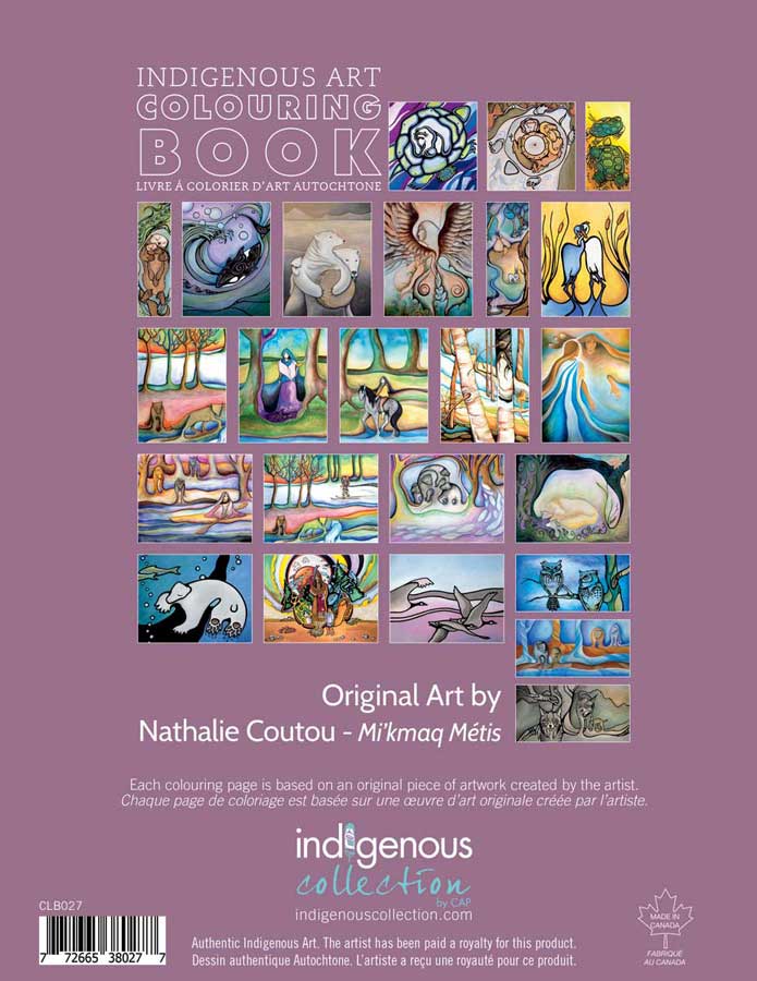 Indigenous art colouring book by artist Nathalie Coutou. Her cultural background is Mi'kmaq Metis. The artist is paid a royalty on every sale.