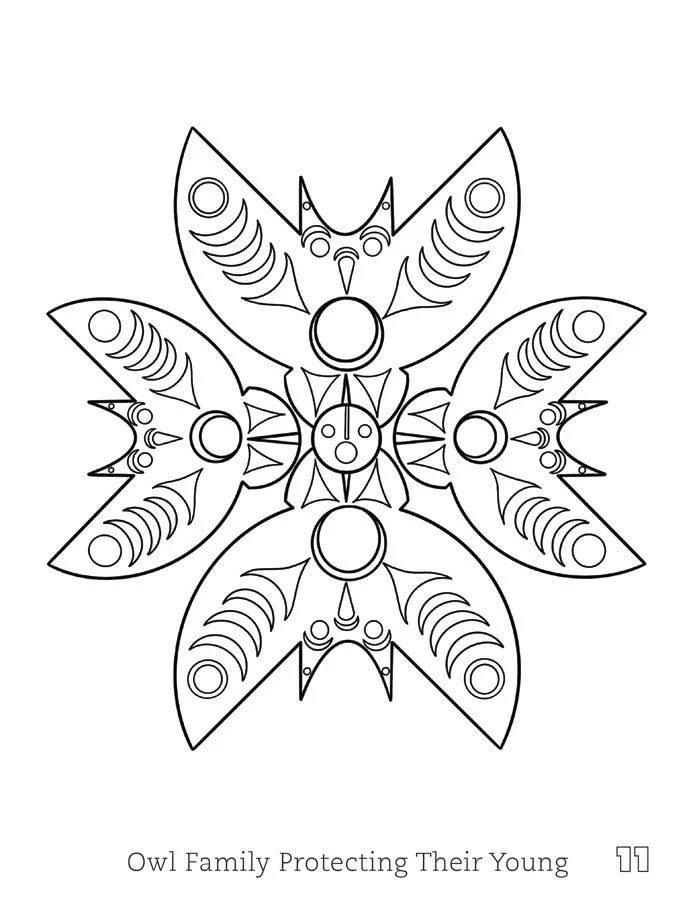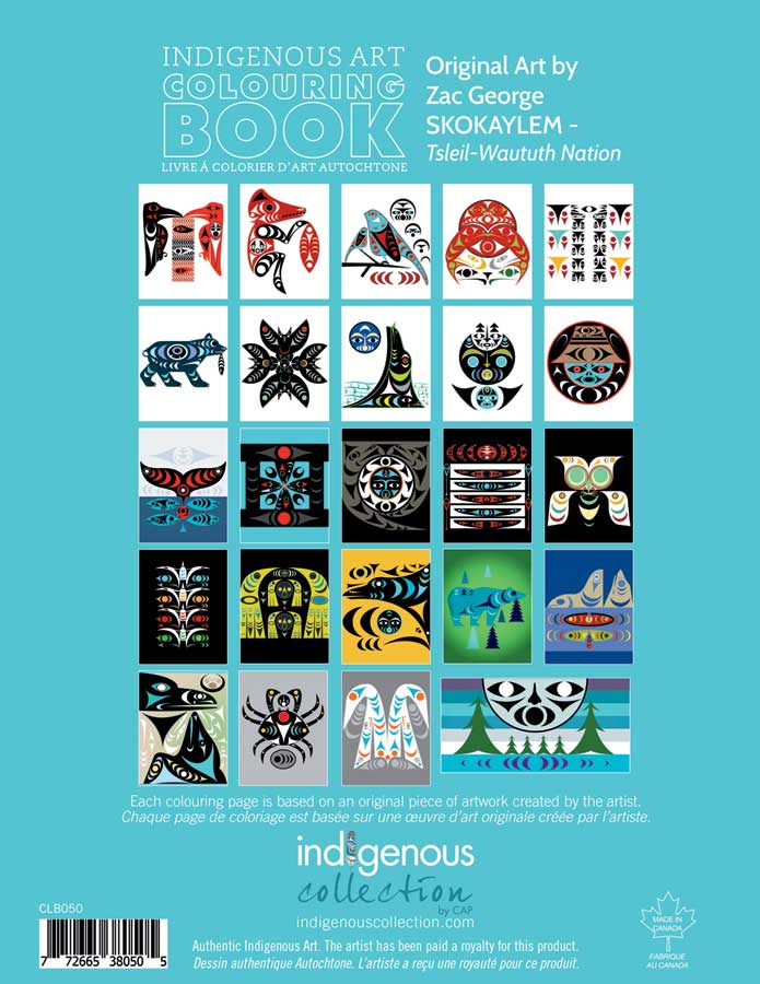 Indigenous art colouring book by artist Zac George SKOKAYLEM. His cultural background is Tsleil-Waultuth Nation The artist is paid a royalty on every sale.