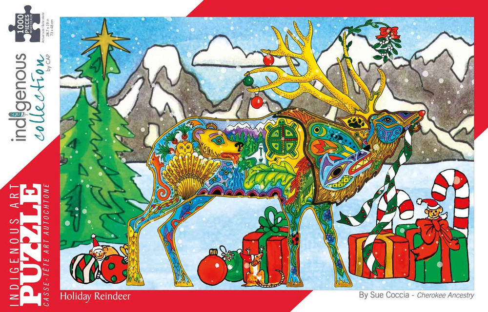 Holiday Reindeer 1000 piece puzzle, by artist Sue Coccia. Her cultural background is Cherokee. The artist is paid a royalty on every sale.
