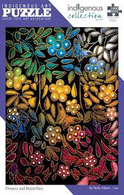 Flowers and Butterflies puzzle, by artist Betty Albert. Her cultural background is Cree. The artist is paid a royalty on every sale.