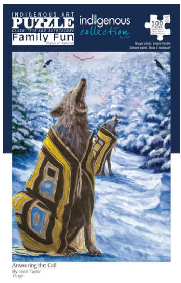 Answering the Call 500 piece Family Fun puzzle, by artist Jean Taylor. Her cultural background is Tlingit. The artist is paid a royalty on every sale.