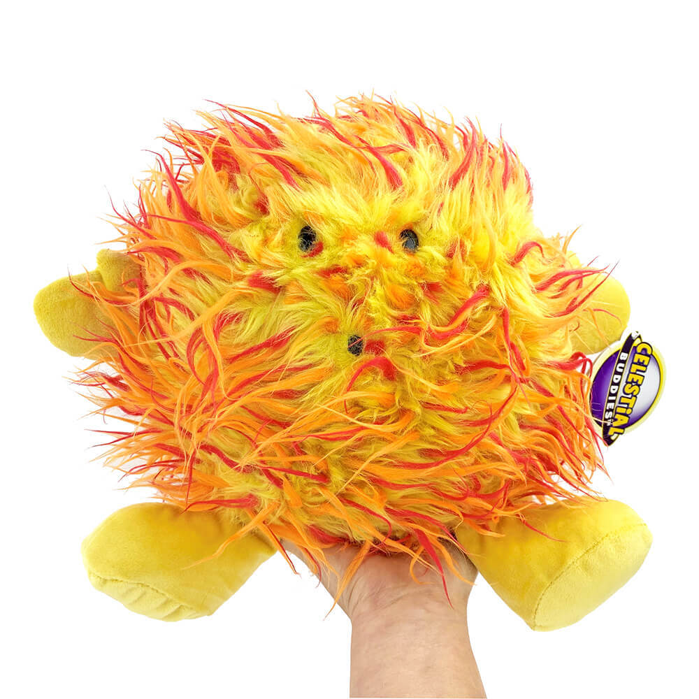 Sun is located at the center of the Solar System. The temperature at its center is a sizzling 15,000,000 Kelvin and on its surface 6,000 Kelvin. Celestial Buddies™ come with fun facts and are great for the classroom, shown in your office, or for kids to play!