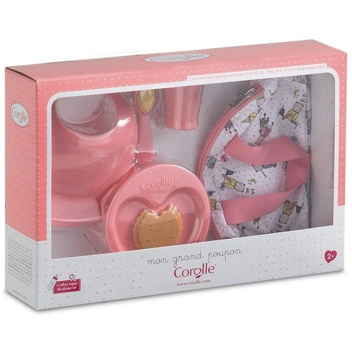Yum. Our Mealtime Set includes these feeding essentials for a large, 14- to 17-inch baby dolls: spoon, feeding plate, juice cup, cookie and crumb-catcher style bib plus a carry-and-storage bag to keep everything neat when playtime is over. Part of the mon grand poupon Corolle collection of dolls, fashions and accessories for little ones wanting to take care of their baby doll the way their parents take care of them.