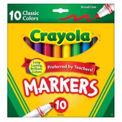 10 ct. Crayola Broad Line Markers are the classic, long-lasting, durable markers you know from your childhood. They lay down lots of brilliant colour, yet don't bleed through most paper.