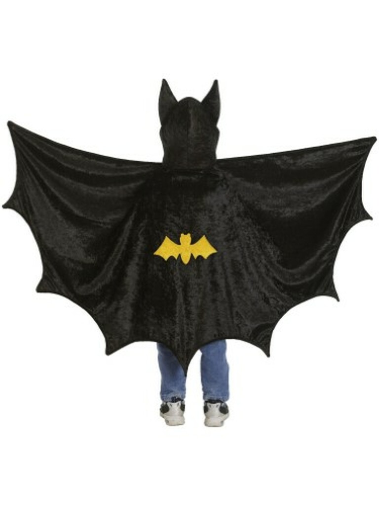 Ready superhero fans! This hooded bat cape features large bat ears on the hood and an awesome bat emblem on the back of the cape. The cape is made from soft velour fabric and is cut like real bat wings with a scalped edge. This made in Canada cape will have you set for many superhero adventures.
