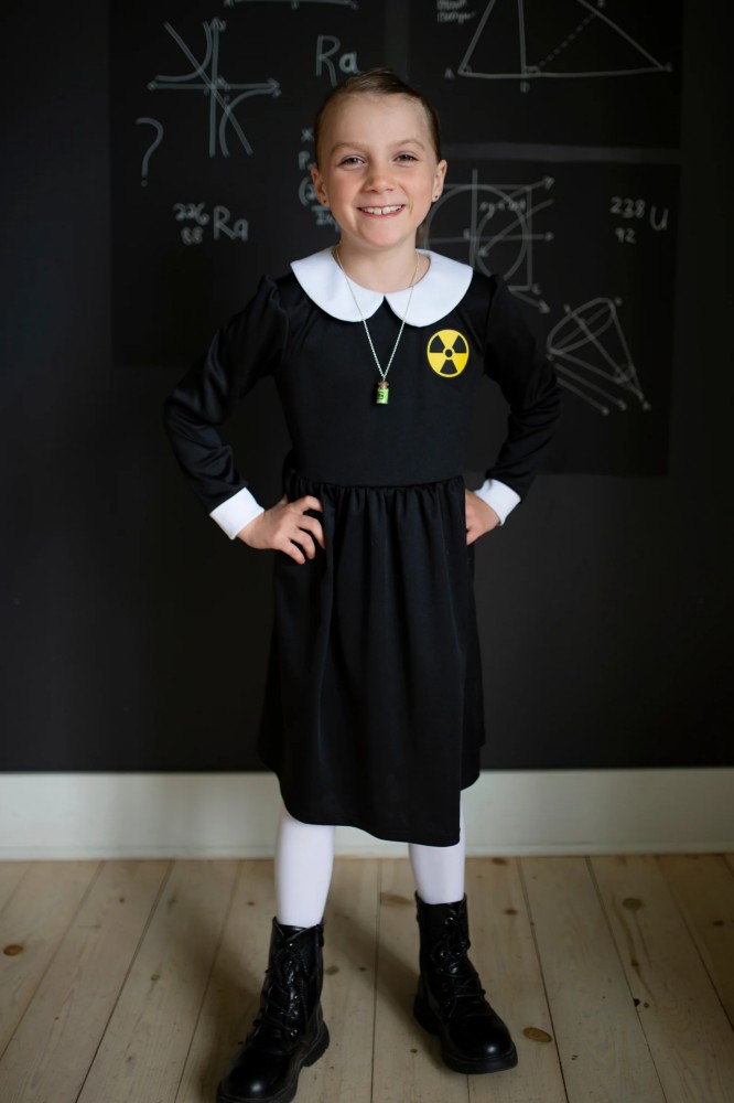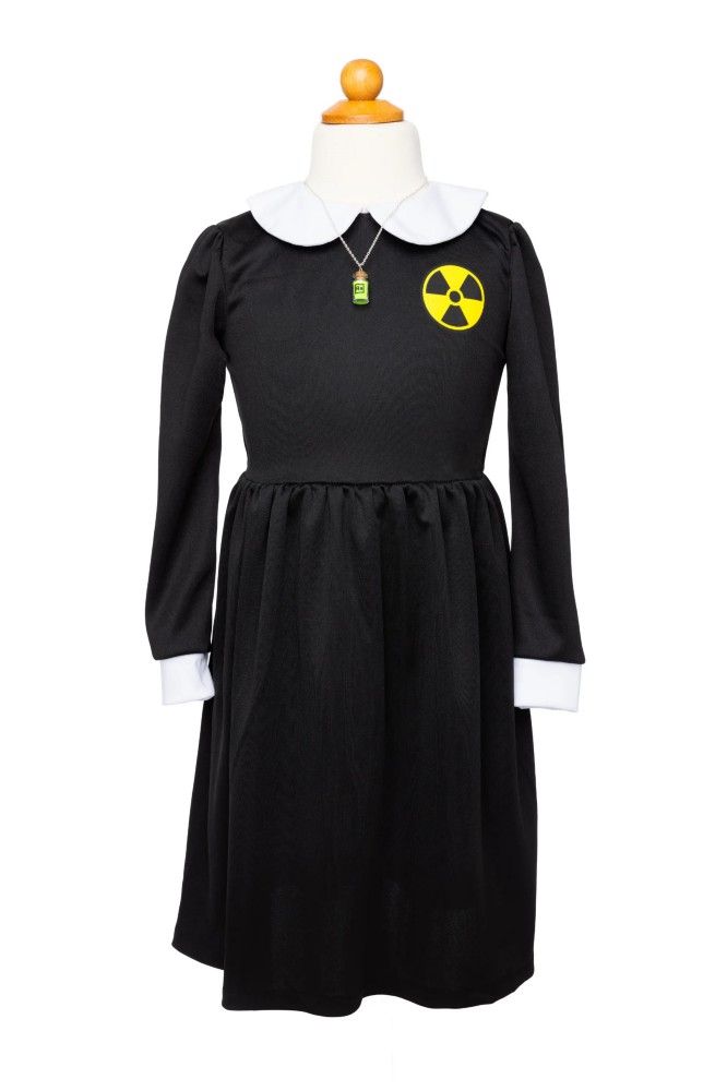 Conduct (top secret) experiments in style with our Marie the Scientist set. This set features a black dress with a white Peter Pan collar, a long white lab coat, and "radioactive" necklace, making it the perfect attire for new discoveries.