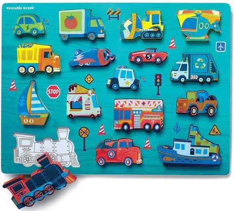 Crocodile Creek's 16-piece Let's Play wood puzzles are a wonderful early learning puzzle with 16 different chunky wood pieces that match an underlying image. The stand-up pieces create a world of imaginative fun on the reverse side with a play scene.