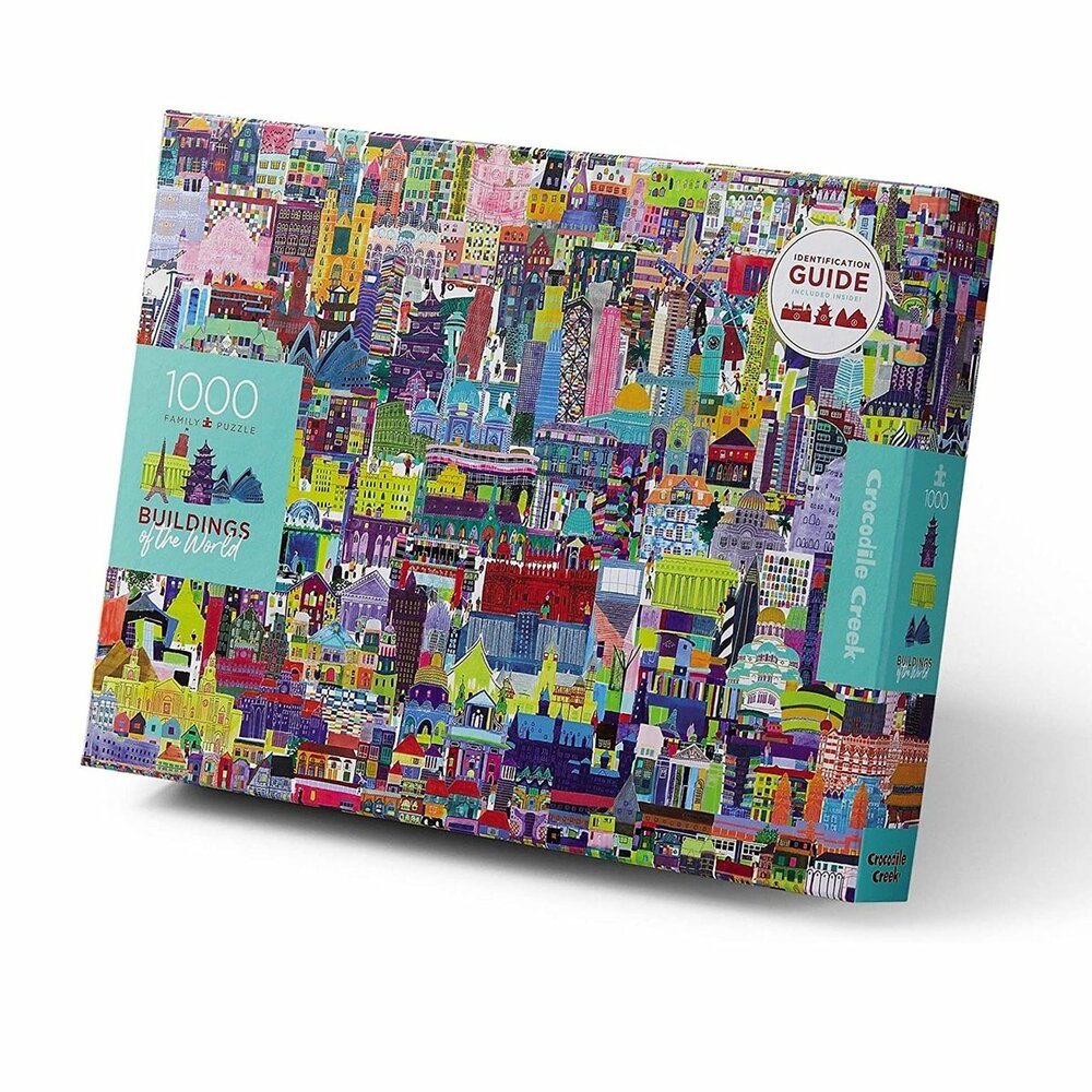 Explore the World! Explore and learn about the world while at home with this beautifully illustrated 1000 pc puzzle showing more than 150 buildings from around the world including the Taj Mahal, the Sydney Opera House, the US Capitol, the Eiffel Tower and many more. On the inside box cover of each puzzle is a wonderful guide to help you identify many of the famous buildings.