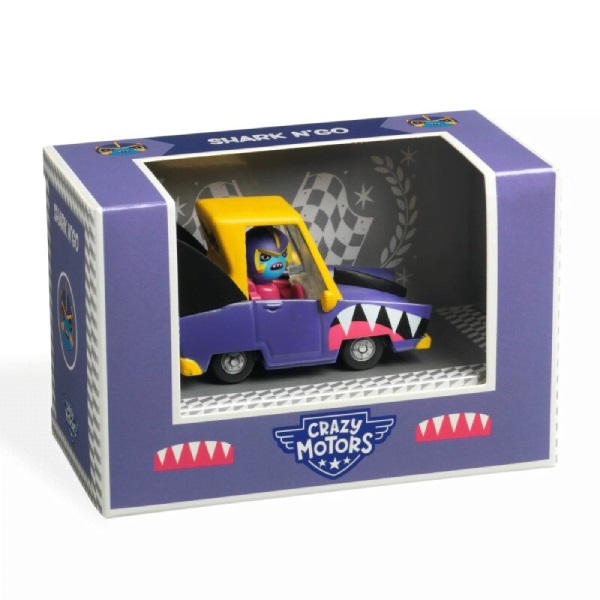 The Shark N'Go car for Crazy Motors is one frightening fish! This car is designed to look like a shark with pointy teeth, has vibrant colours and features a matching driver.