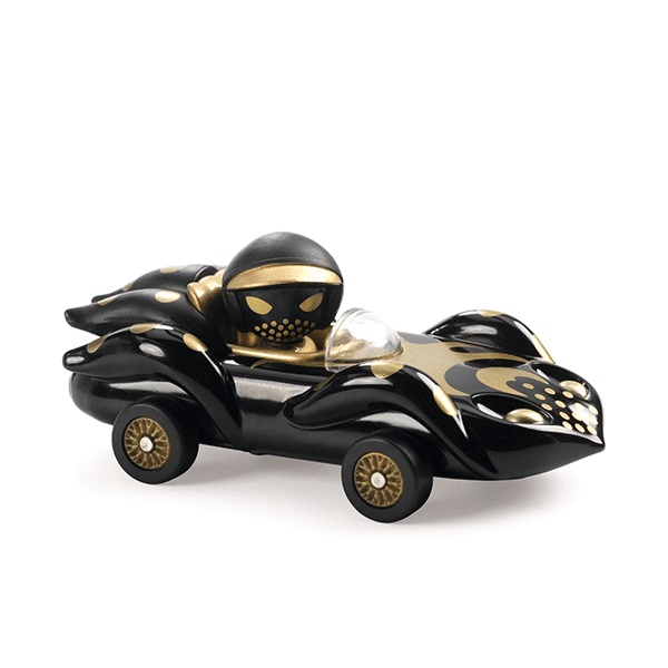 The Fangio Octo car for Crazy Motors brings elegance to the race track! This aquatic-themed car has an octopus pattern, aerodynamic tentacles, and a matching driver.