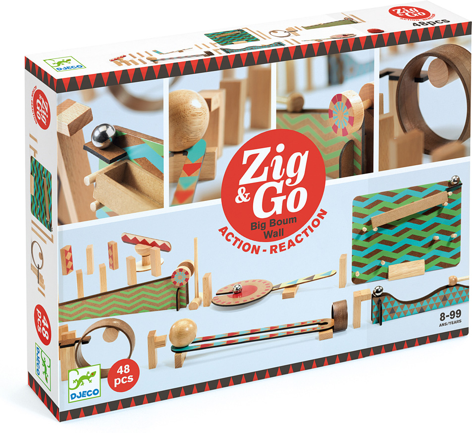 Chain reaction meets domino action in this awesome STEM-skill-building set. 48 high-quality solid wood pieces include wobble wheel, wave ramp, 'zig-zag' wall and more. Set them up in different layouts, start the action, and ring the bell for a big finish. Combine with other sets for the ultimate Zig & Go experience!