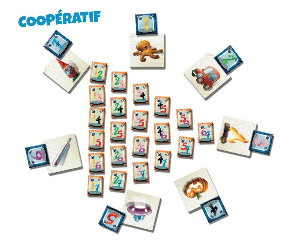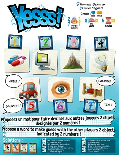 Yesss! is a party game, one in which communication is the key to saving humanity against itself! Professor Emmet BLUE, a brilliant though slightly mad scientist, is sure about this, and he and his students have developed an experiment to increase our mutual comprehension skills: Translating an association of two pictures into one single concept that must be understood by others. Can you be Professor BLUE’s most brilliant disciple? Yesss! features two play modes — co-op & versus — and in both you're trying to make others guess a pair of objects by giving them only a single word as a clue. In the versus mode, you win by having the most brain tokens; in the co-op mode, you're trying to identify as many pairs as possible in three minutes.