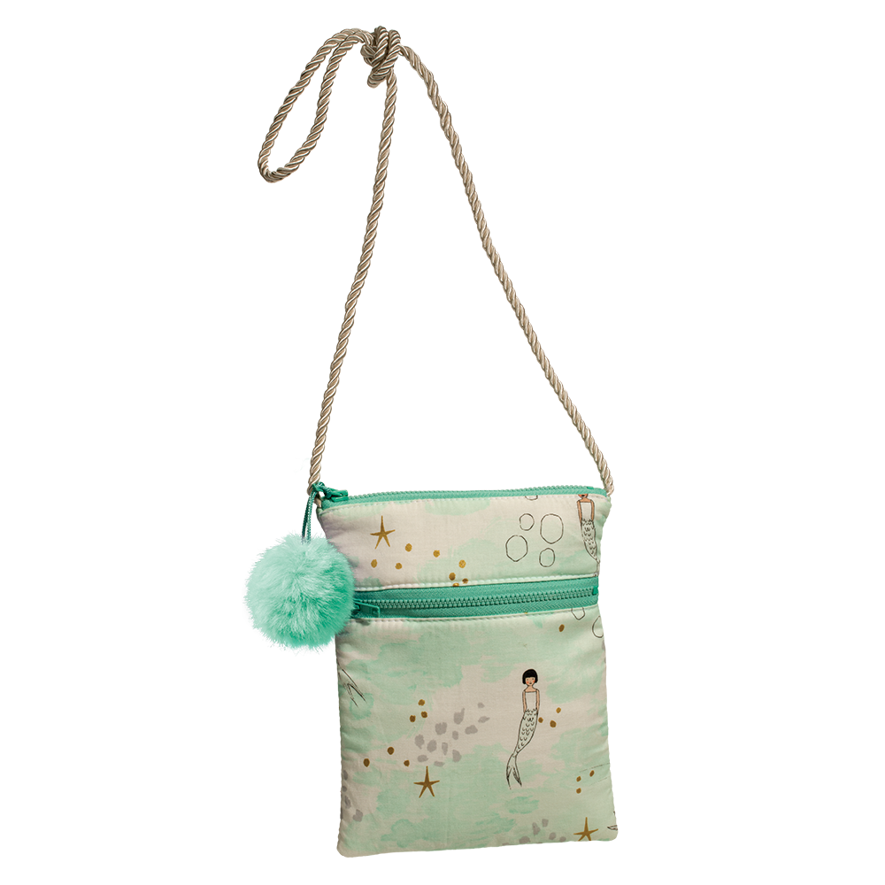 Sea Magic cross body bag in a fresh minty green and glitter golden mermaid print. Two zippered openings, one smaller in front, a soft white rope strap (can be knotted for altered length) and a fun, ultra soft minty pom adorned at the side!