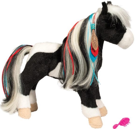 With her bold black and white pinto pattern, Warrior the plush Princess Horse is a handsome steed indeed! Colorful blue and red ribbons mingle throughout her long mane and tail and a feather and bead accessory accent can be found behind her ear. Warrior comes with her own brush so you can keep her luxurious long locks looking their best or try out some of today’s trending hair styles on her! Designed in an engaging standing pose, Warrior promotes imaginative play. Whether it’s galloping off on a wild adventure or taking part in some fashion fun, this cuddly painted pony stuffed animal is up for anything!
